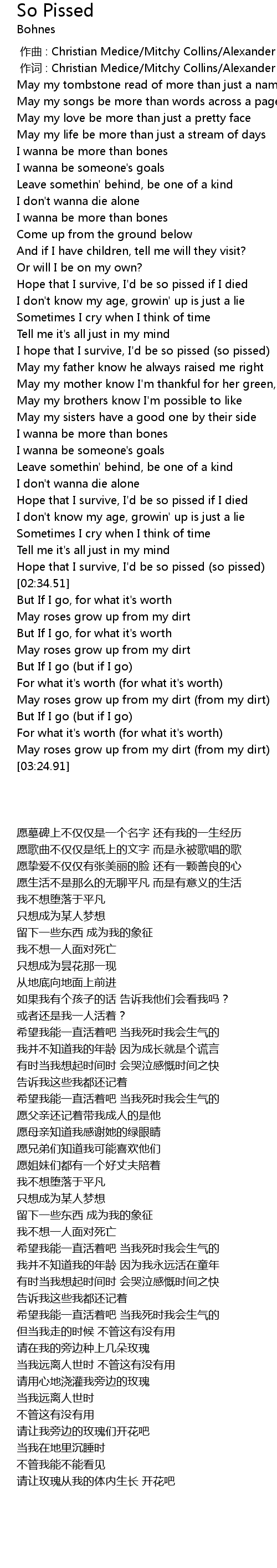 | [02:16.10] | Hope that I survive, I' d be so pissed so pissed |