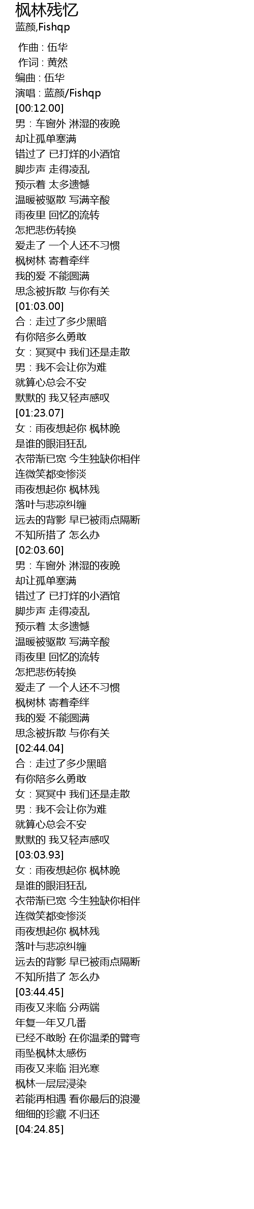 | [03:24.04] | 雨夜想起你 枫林残 |