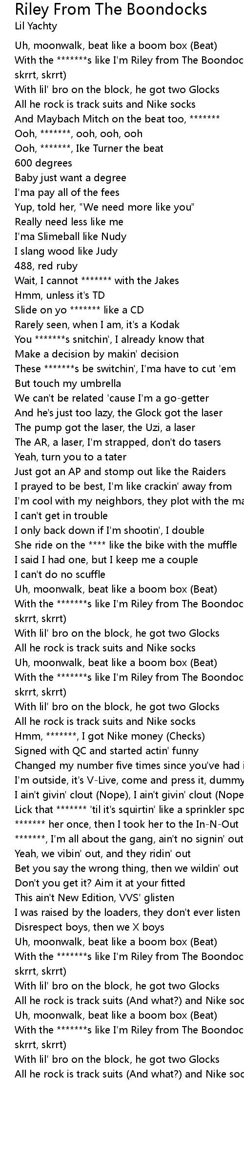 With the *******s like I'm Riley from The Boondocks (Skrrt, skrrt, skrrt, skrrt) |