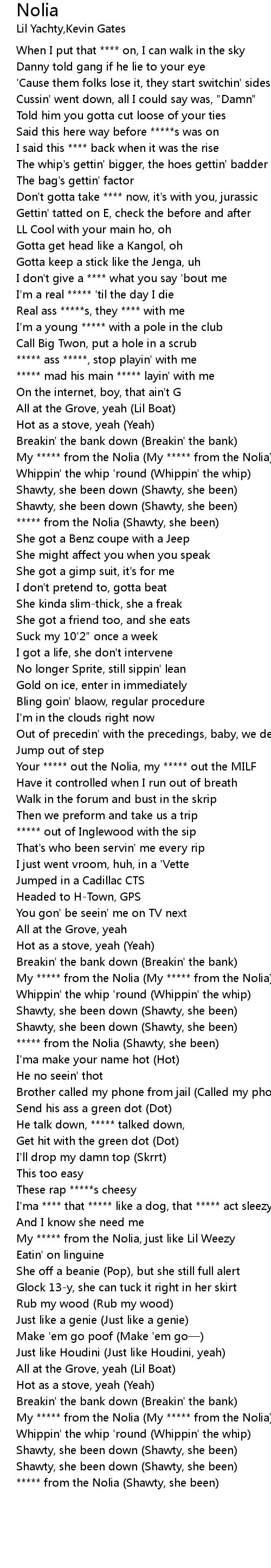 | [03:06.91] | ***** from the Nolia (Shawty, she been) |