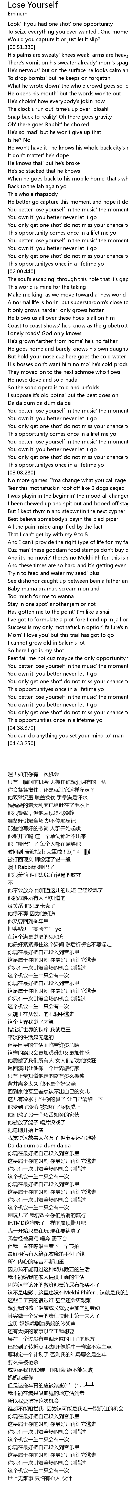| [02:45.760] | You better lose yourself in the music' the moment |