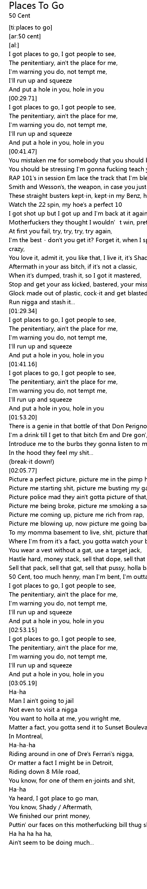 | [02:38.91] | 50 Cent, too much henny, man I'm bent, I'm outta here |