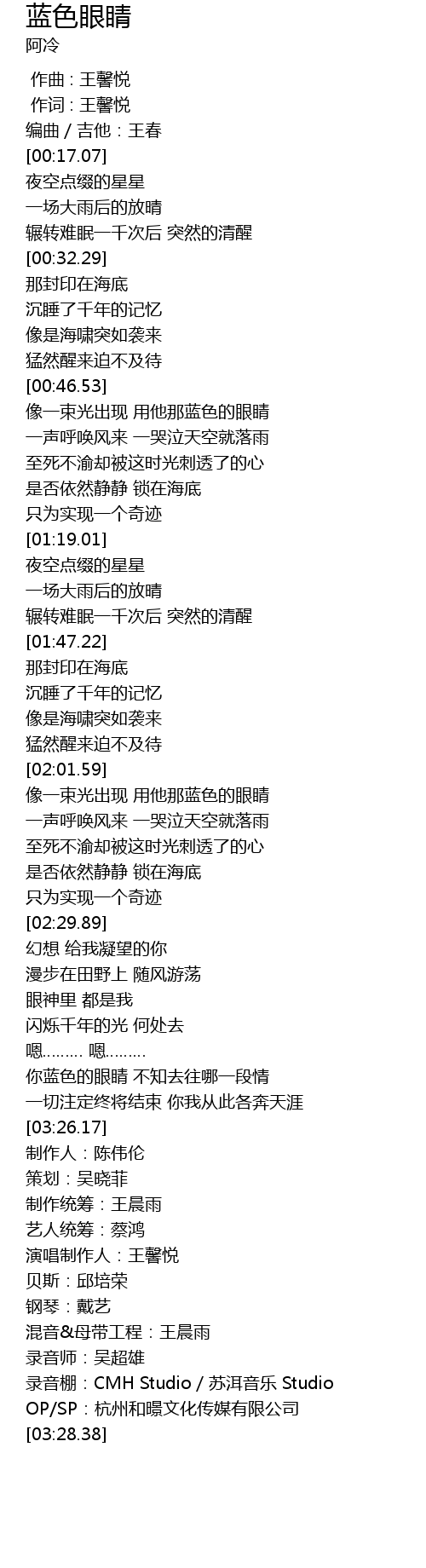 | [03:27.66] | 混音&母带工程:王晨雨 |