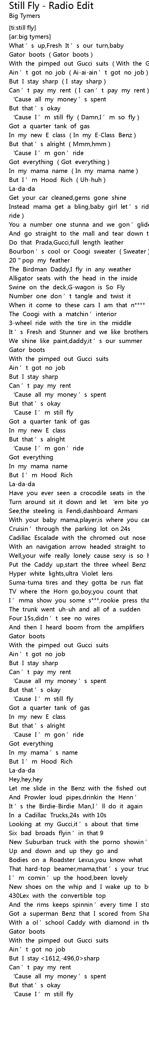 | [01:45.913] | ‘Cause I ’m still fly |