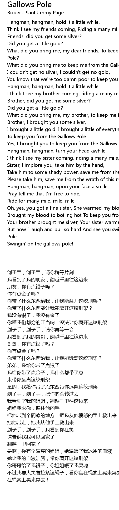 [00:33.39] What did you bring me, my dear friends, To keep me from the Gallows Pole?