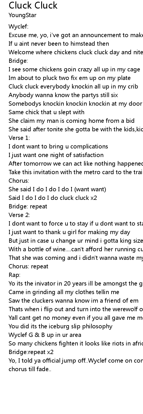 Welcome where chickens cluck cluck day and nite (G & B) |