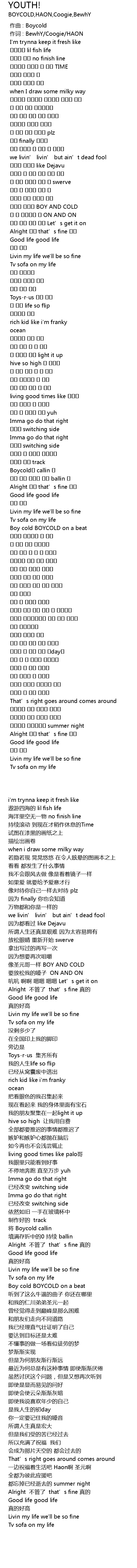 | [00:01.000] | 作词 : BewhY/Coogie/HAON |