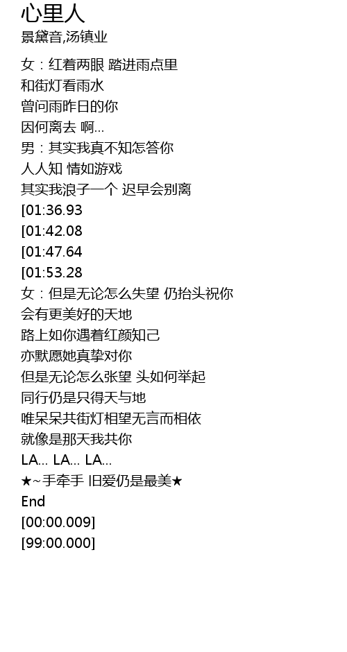 | [02:21.25][01:36.93][00:53.12] | 女:离别你 路上再也无阳光 |