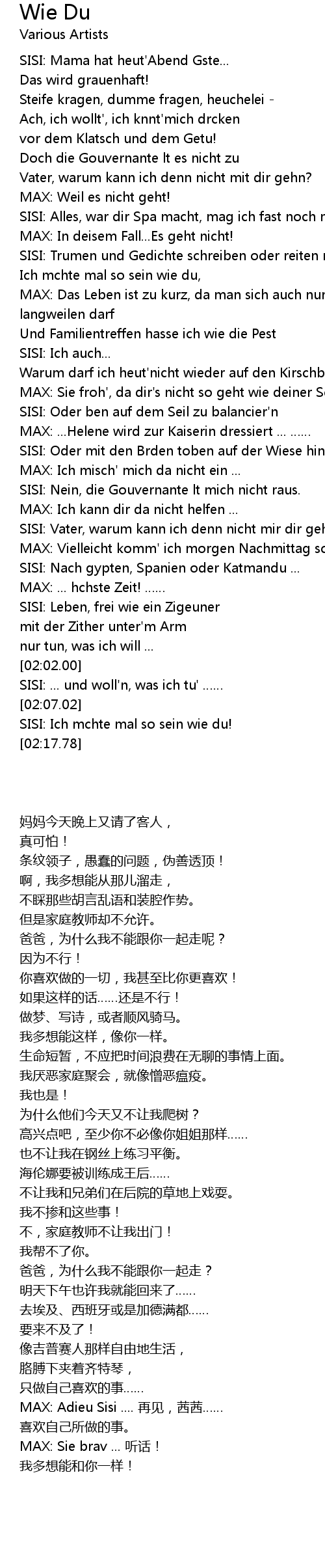 | [02:03.69] | SISI: ... und woll'n, was ich tu' …… |