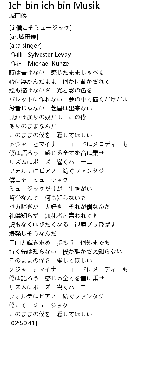 | [02:12.19] | 僕は語ろう 感じる全てを音に乗せ |
