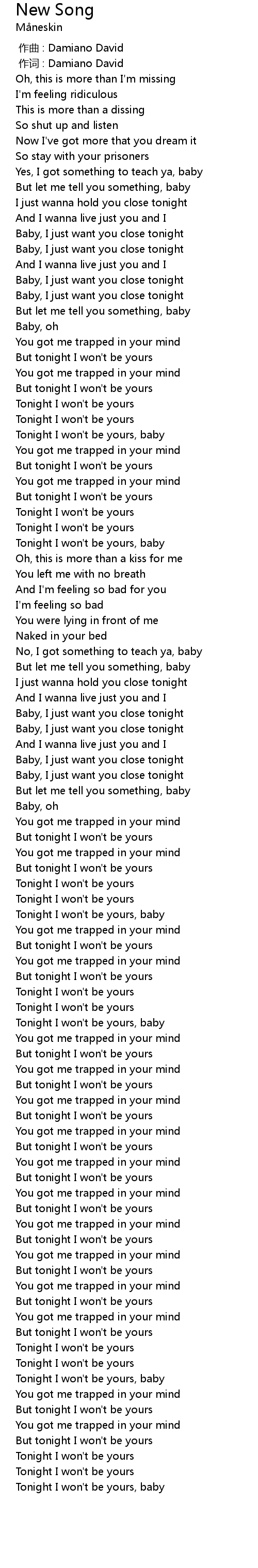 | [02:23.42] | Tonight I won' t be yours, baby |