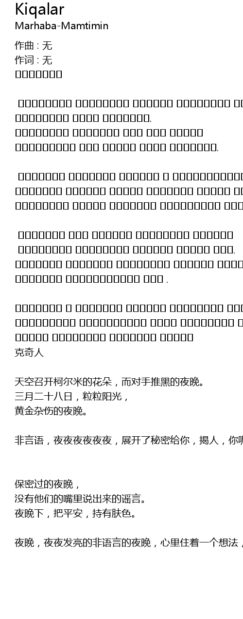 | كېچىلەر كېچىلەر تىلسىز ، كېچىلەر،ئىمانەن سىرىمنى بەردىم ساڭا، چاۋامنى چىتقا يايدى كىشىلەر، سەنچۇ ۋاپالار كۆرسەتتىڭ ماڭا | |
