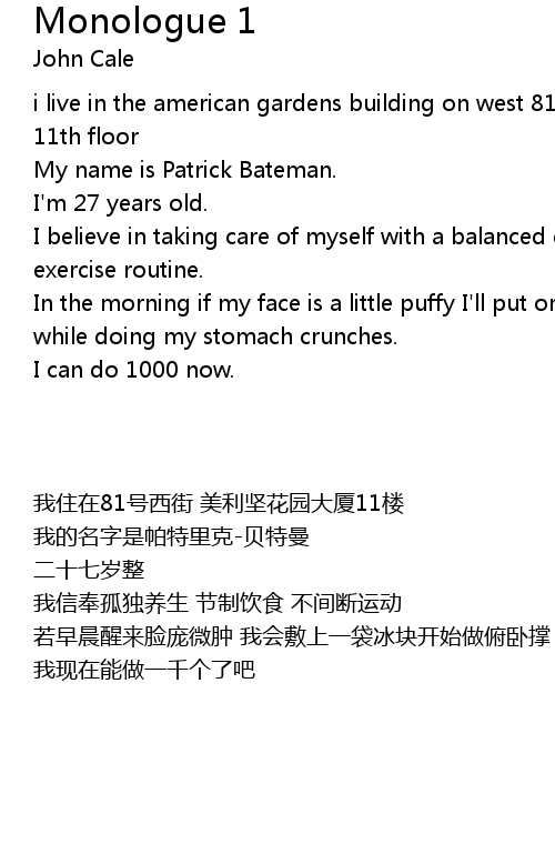 | [00:10.11] | My name is Patrick Bateman. |
