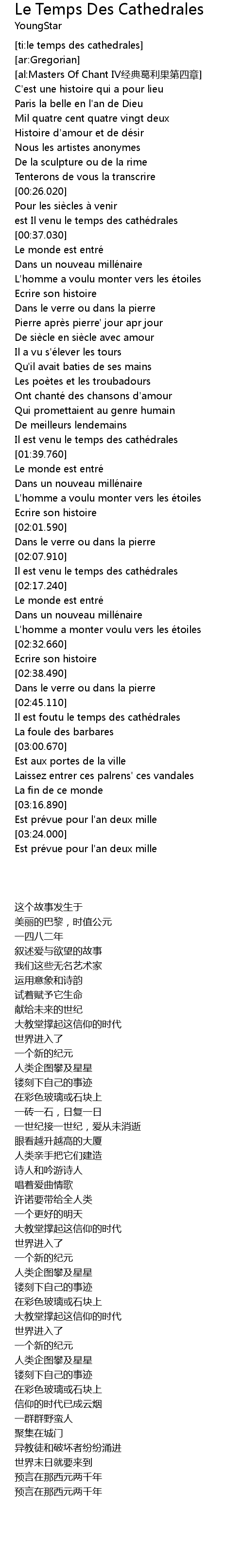 | [02:10.030] | Il est venu le temps des cathédrales |