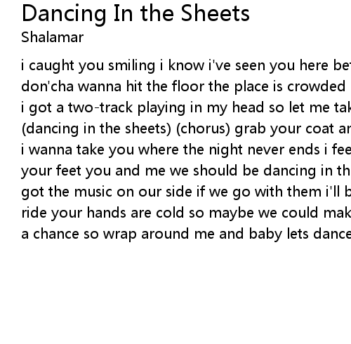i caught you smiling i know i've seen you here before howcome your hiding hey don'cha wanna hit the floor the place is crowded or maybe you dont like the beat i got a two-track playing in my head so let me take you somewhere else instead (dancing in the sheets) (chorus) grab your coat and wave goodbye to your friends i wanna take you where the night never ends i feel the need to sweep you offer your feet you and me we should be dancing in the sheets we got the rhythm we've got the music on our side if we go with them i'll bet we'll have a wonderful ride your hands are cold so maybe we could make some heat love is always born on a chance so wrap around me and baby lets dance (dancing in the sheets) (chorus) |