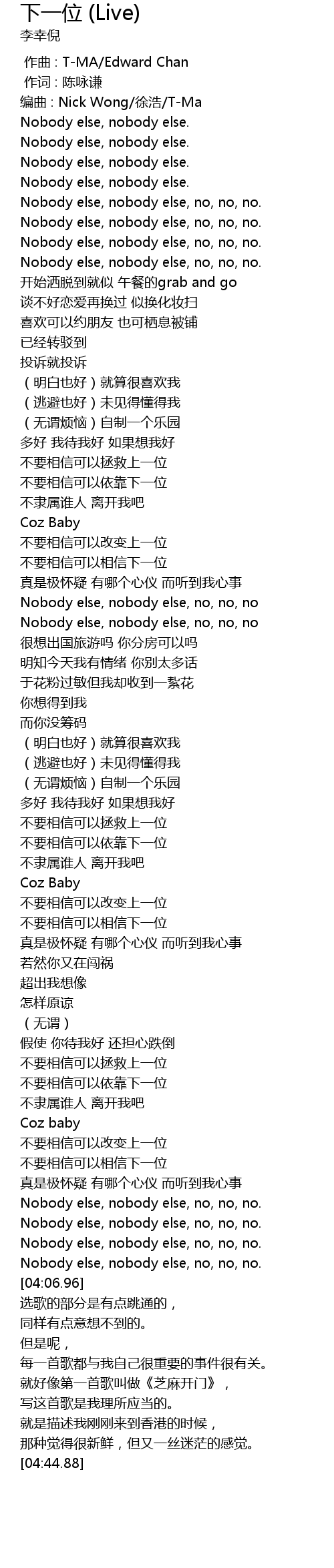 | [03:44.94] | Nobody else, nobody else, no, no, no. |