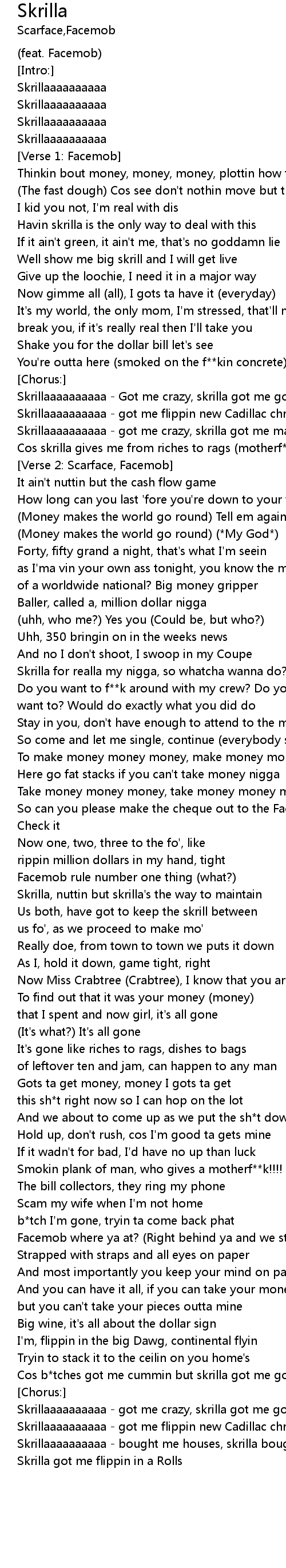 | Cos b*tches got me cummin but skrilla got me goin | |