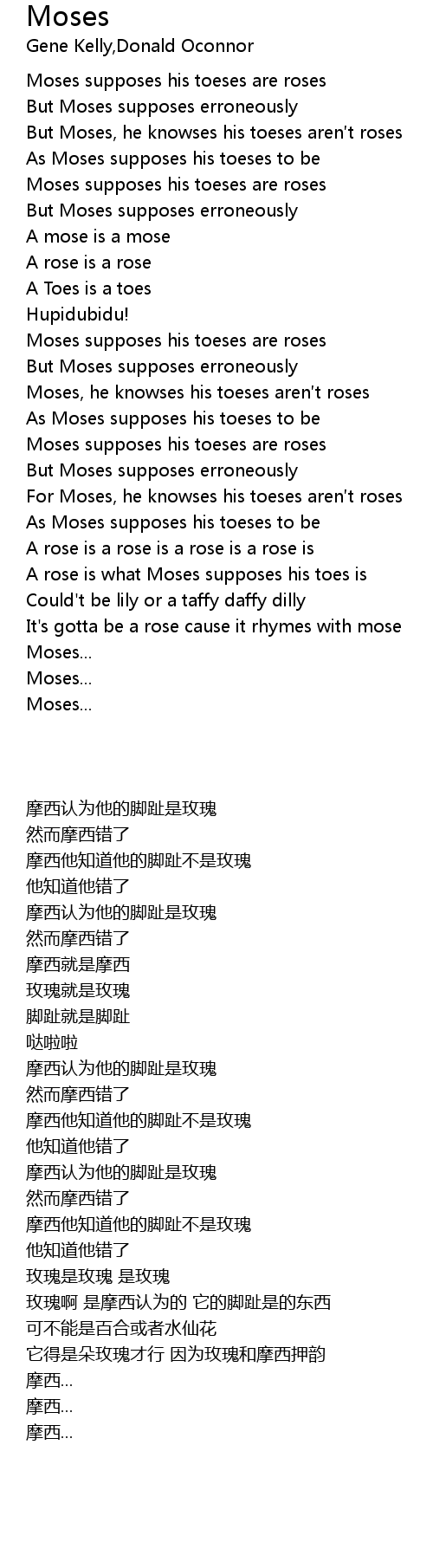 | [00:00.500] | Moses supposes his toeses are roses |