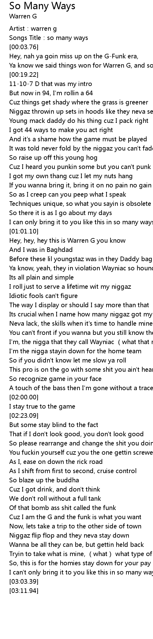 | [01:21.70] | Hey, hey, hey this is Warren G you know |