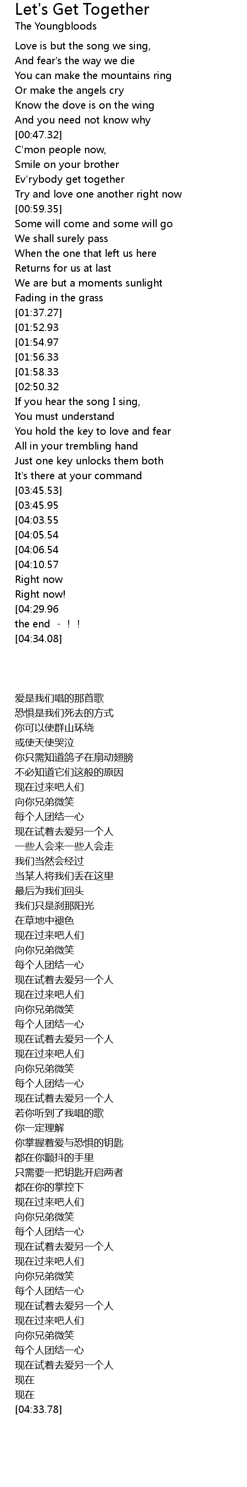 | [02:46.16][01:58.33][01:45.63] | Try and love one another right now |