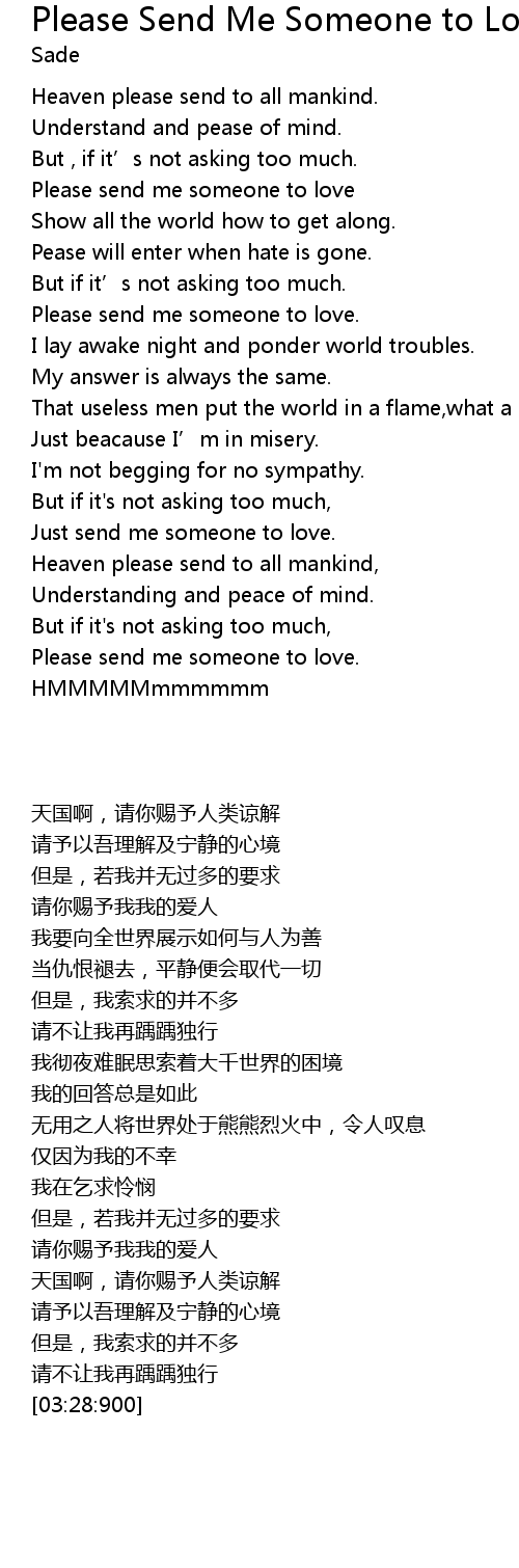 | [03:19:900] | Please send me someone to love. |