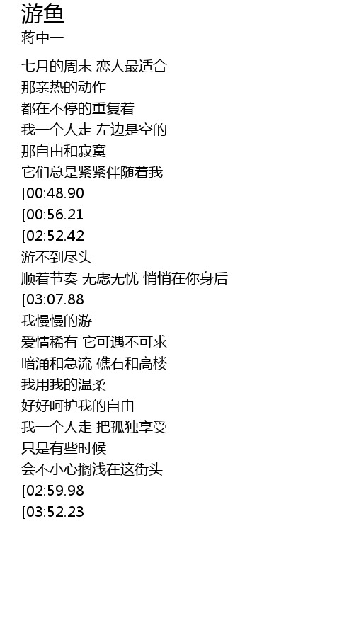 | [03:43.50][03:07.88][01:19.20] | 城市里我 走走游游 走走游游 游 我慢慢的游 |