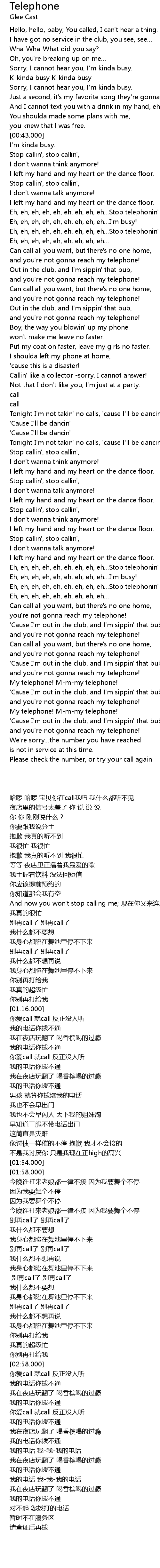 | [01:12.000] | Eh, eh, eh, eh, eh, eh, eh, eh, eh…Stop telephonin' me! |
