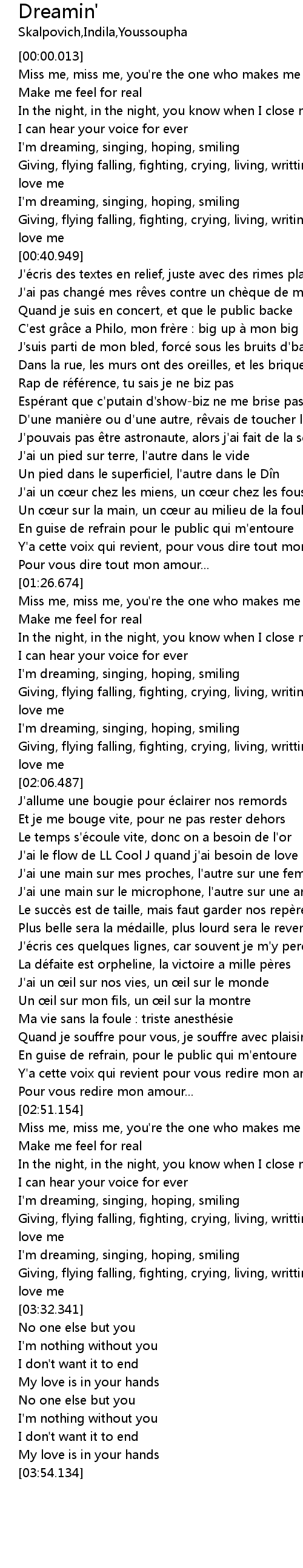 | [00:41.492] | J'e cris des textes en relief, juste avec des rimes plates |