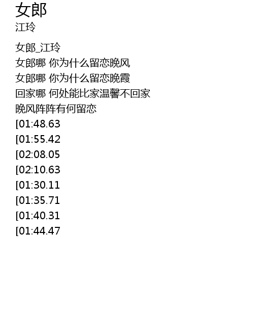 | [03:01.41][01:55.42][01:08.06] | nǚ láng nǎ nǐ wèi shí me liú liàn hǎi àn bù huí jiā |