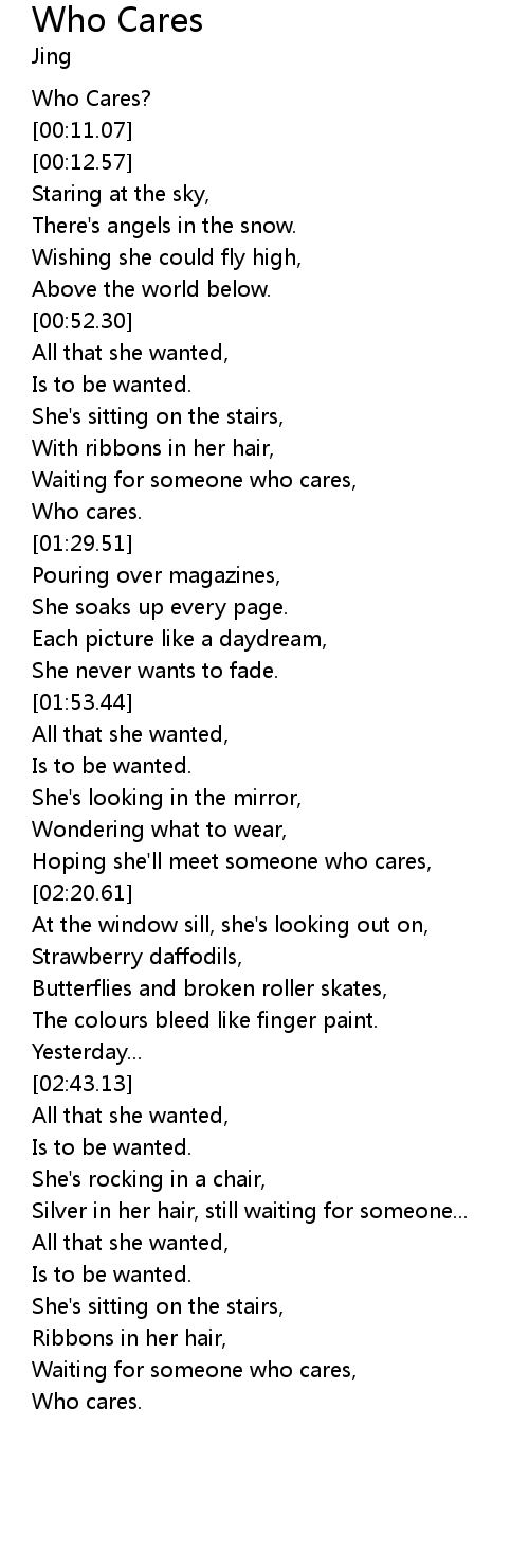 | [02:13.78] | Hoping she'll meet someone who cares, |