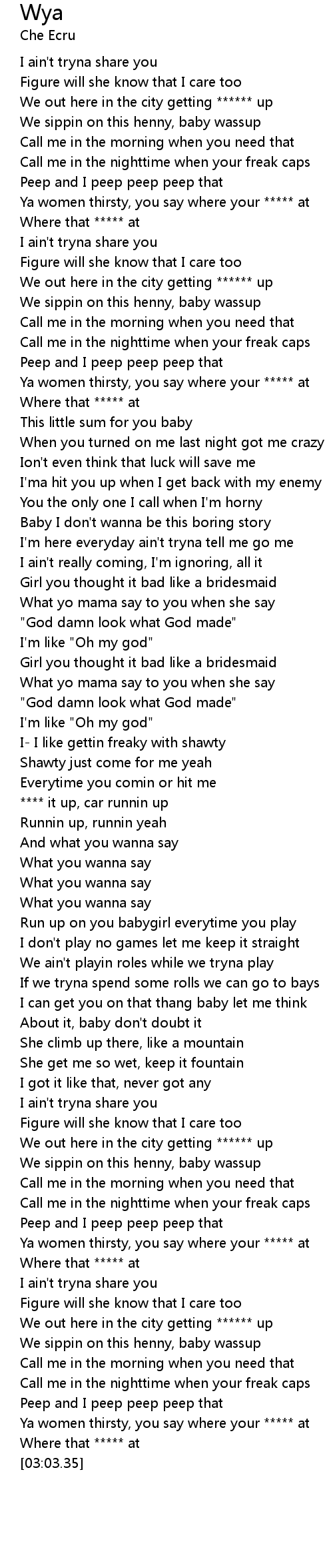| [00:56.99] | Ya women thirsty, you say where your ***** at |