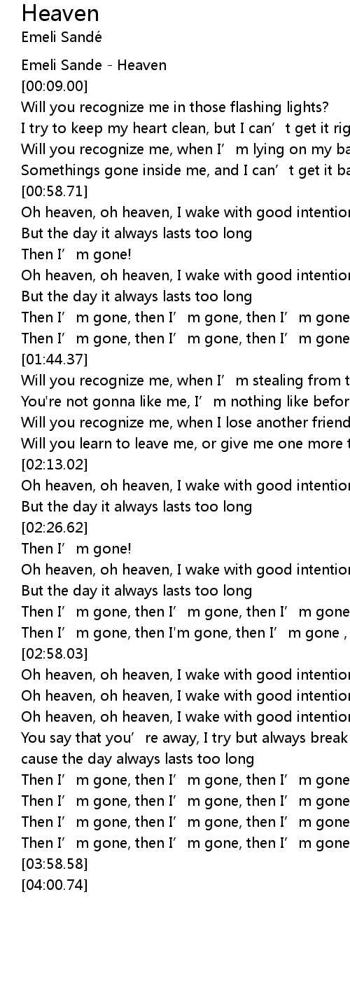 | [01:16.07] | Oh heaven, oh heaven, I wake with good intentions, |