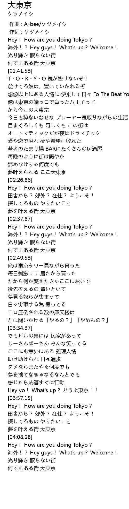 | [03:54.63] | Hey yo! What's up? どうよ東京!! |