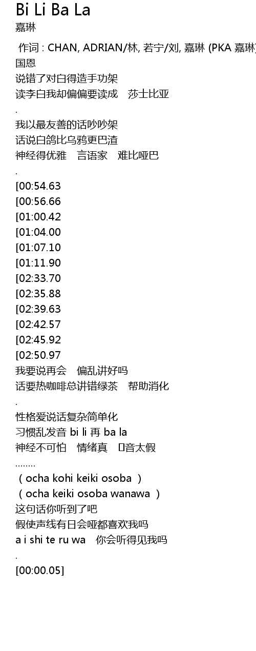 | [03:36.73][02:45.92][01:26.71] | bi li ba la la ba 发音标准到害怕 |