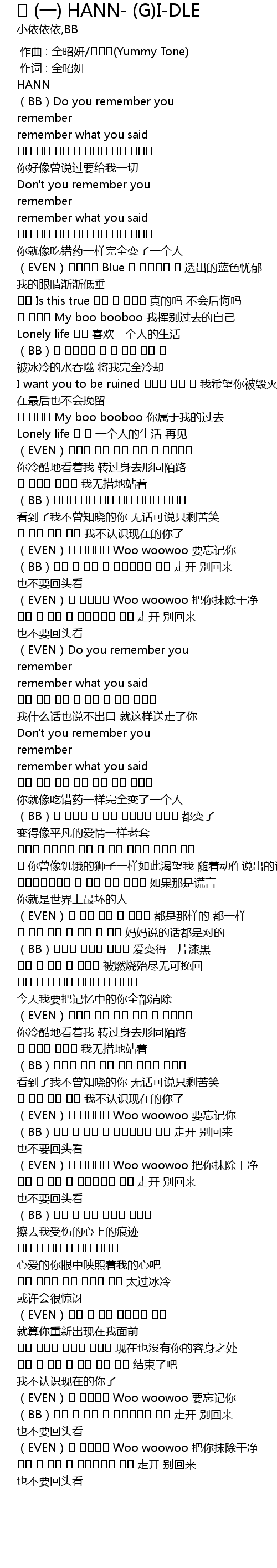 | [00:55.47] | (BB)몰랐던 너를 봤다 그저 웃음만 나온다 看到了我不曾知晓的你 无话可说只剩苦笑 |