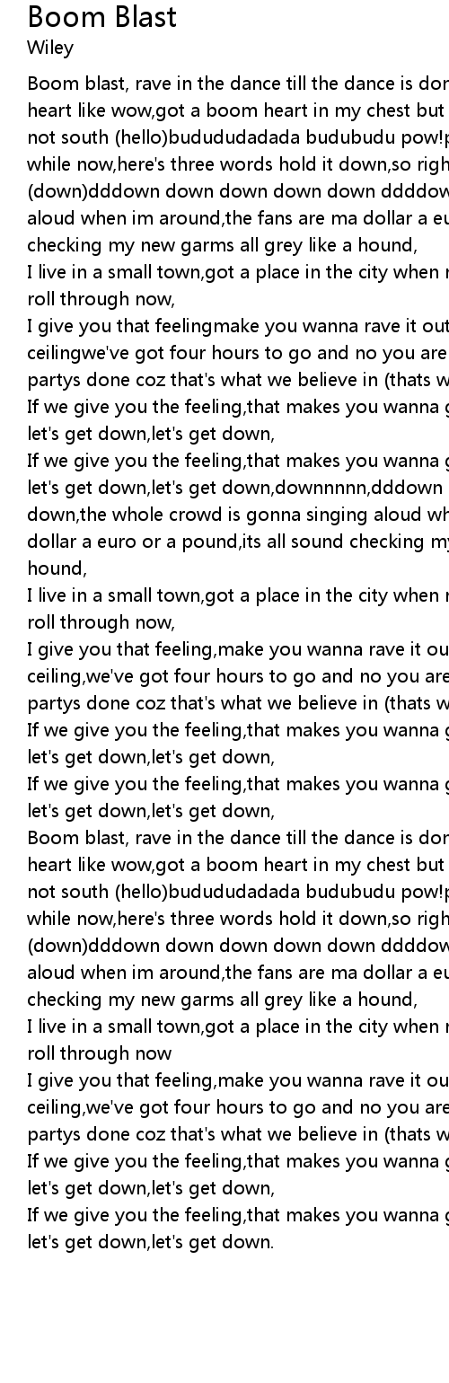 Boom blast, rave in the dance till the dance is done, ladies playing with my heart like wow,got a boom heart in my chest but how,when i flow cold north pole not south (hello)budududadada budubudu pow!peace love in my heart it's been a while now,here's three words hold it down,so right now i am gonna hold downnnnn (down)dddown down down down down ddddown down,the whole crowd is gonna singing aloud when im around,the fans are ma dollar a euro or a pound,its all sound checking my new garms all grey like a hound,