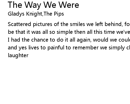 | Scattered pictures of the smiles we left behind, for the way we were. could it be that it was all so simple then all this time we've written every night and if I had the chance to do it all again, would we could we memories may be beautiful and yes lives to painful to remember we simply choose to forget so its the laughter |