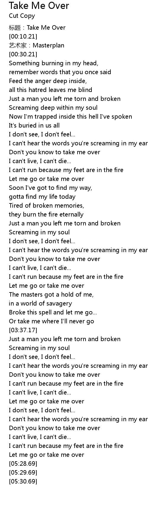 | [00:00.00] | 标题:Take Me Over |
