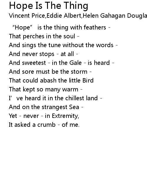 | [00:01.000] | " Hope" is the thing with feathers |
