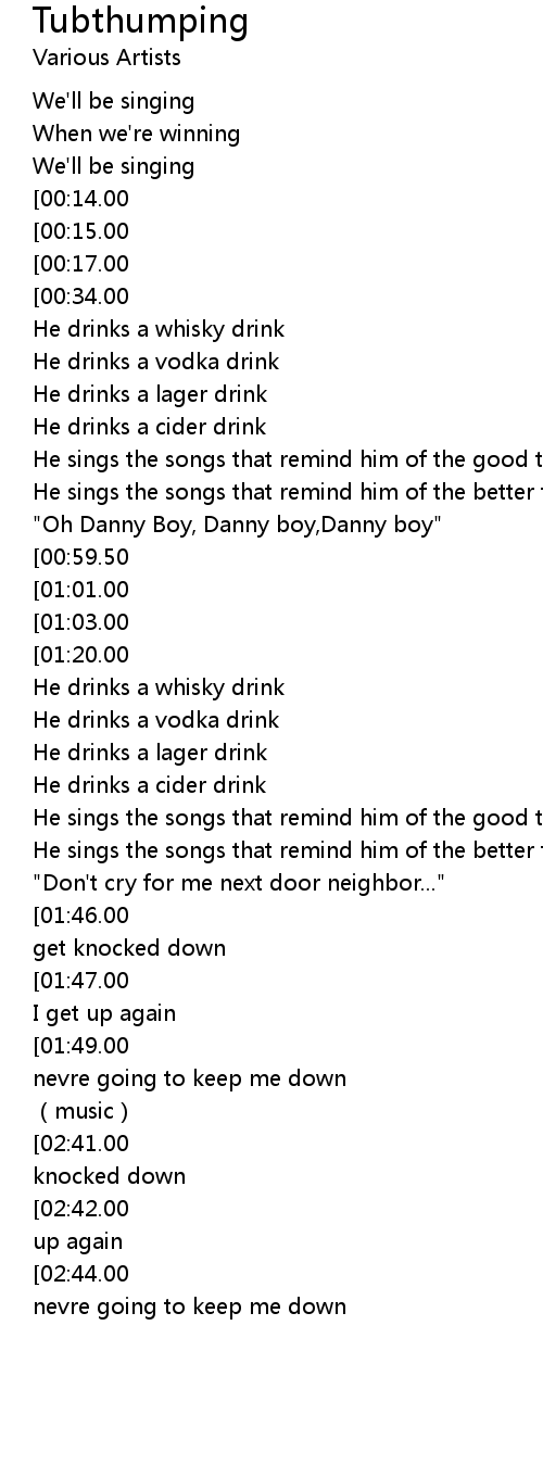 | [01:44.00][01:49.00][01:54.00][01:59.00][02:21.00][02:26.50][02:31.00][02:36.00] | You're nevre going to keep me down |