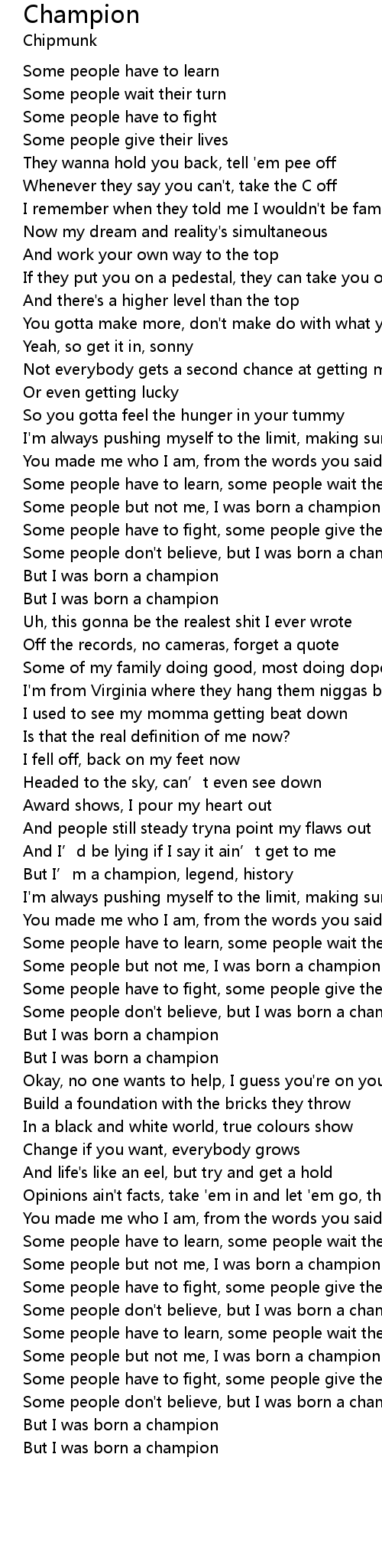 | [03:06.82] | Some people but not me, I was born a champion |