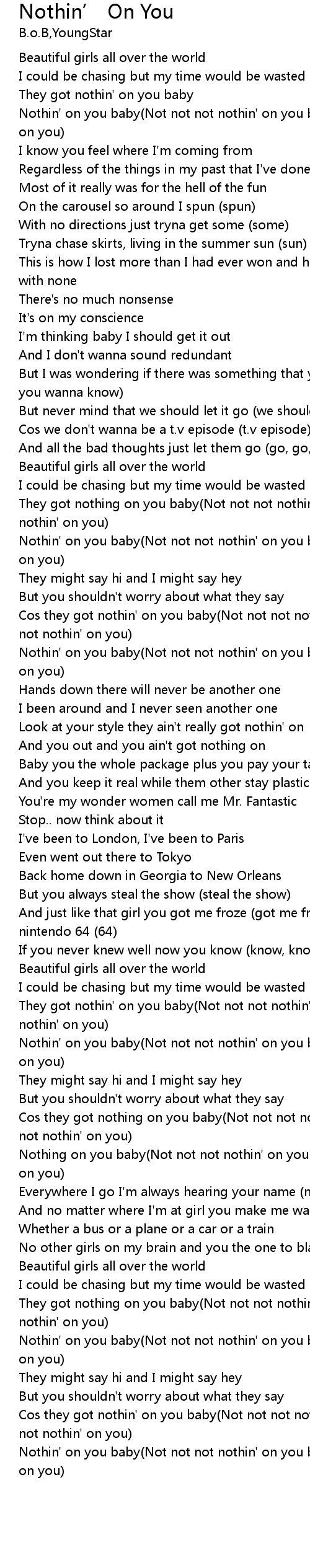 | [01:04.680] | They got nothing on you baby(Not not not nothin' on you babe,not not nothin' on you) |