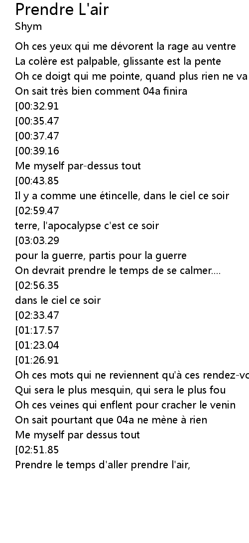 | [02:45.41][01:26.91] | D'aller prendre l'ai-ai-ai-air-air, l'ai-ai-ai-ai-ai-air |