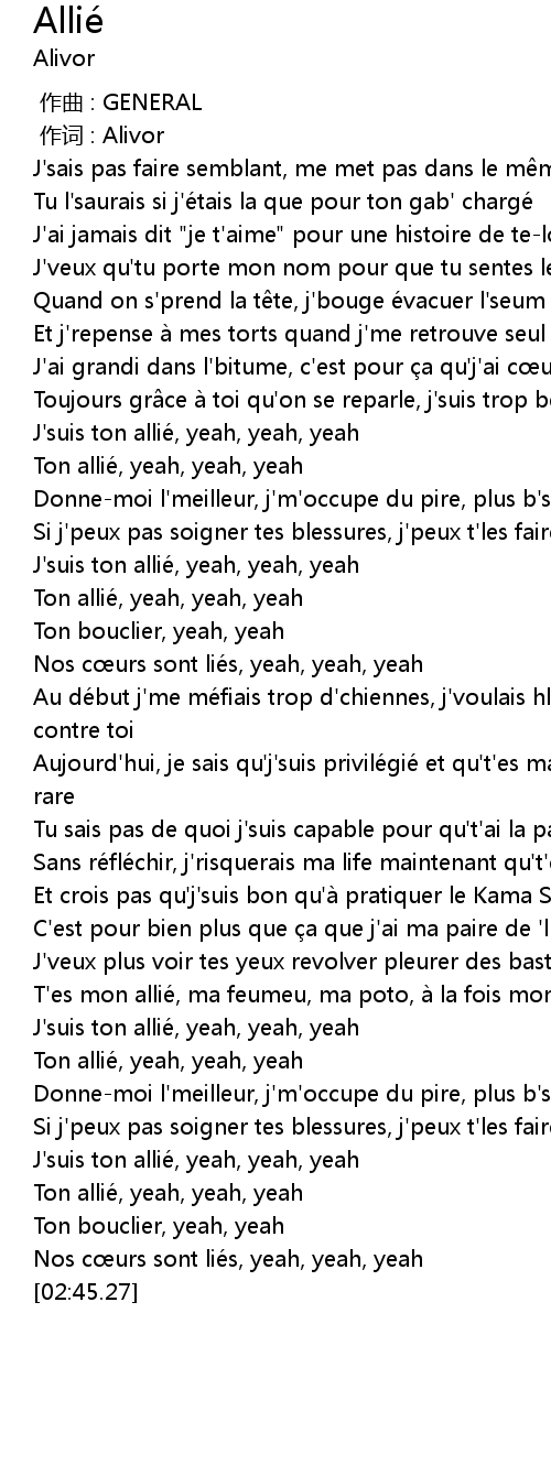 | [02:26.29] | J'suis ton allié, yeah, yeah, yeah |