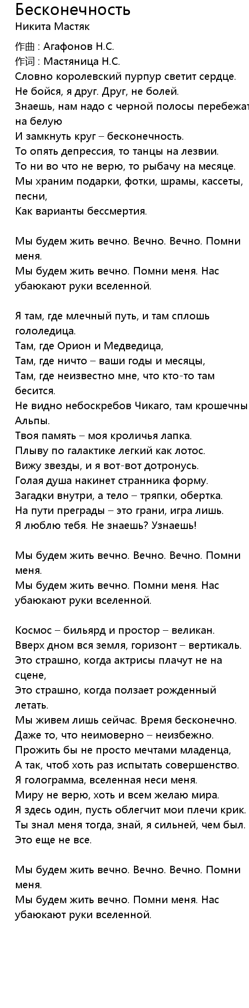Мы будем жить вечно. Помни меня. Нас убаюкают руки вселенной. |