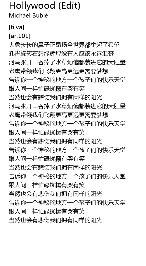 | [00:16.244] | 大象长长的鼻子正昂扬全世界都举起了希望 |