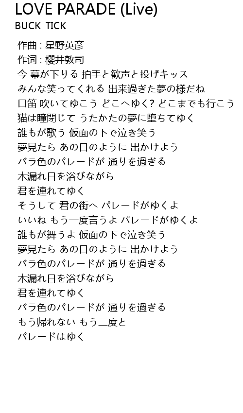 | [02:21.559] | いいね もう一度言うよ パレードがゆくよ |
