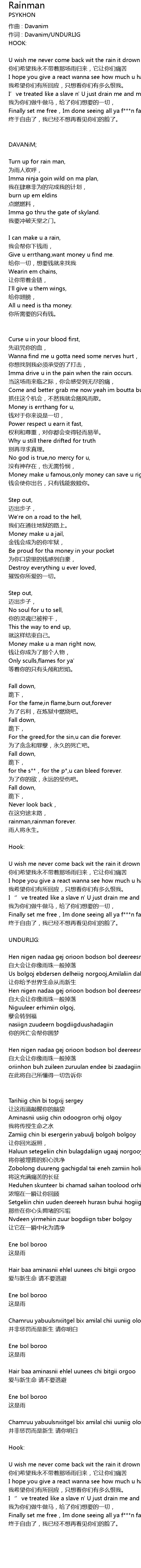 | U wish me never come back wit the rain it drown u in the pain, | |