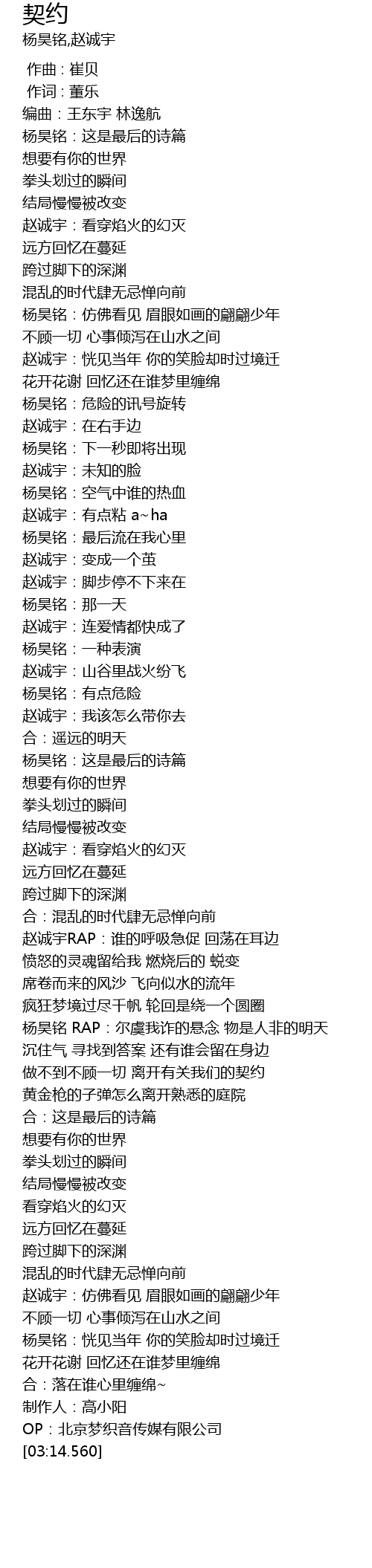 | [02:14.830] | 杨昊铭 RAP:尔虞我诈的悬念 物是人非的明天 |