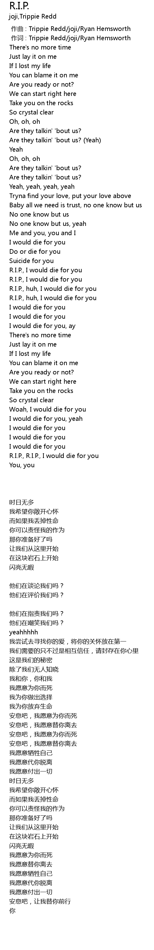 | [02:19.60] | R.I.P., R.I.P., I would die for you |